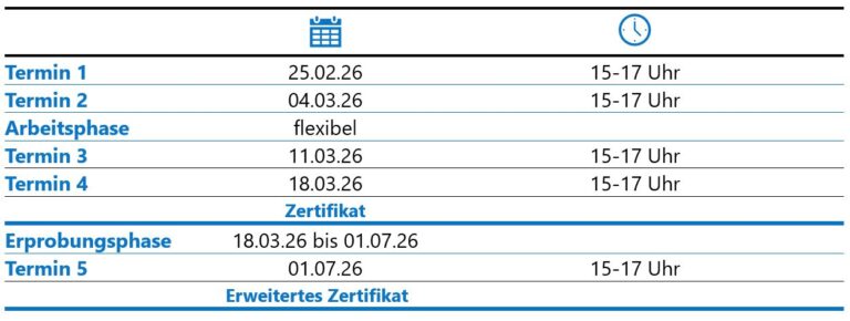 Vier kompakte Online-Termine und eine flexible Arbeitsphase ergeben ein erstes Zertifikat – und für alle, die mehr wollen: Unterricht erproben and ein erweitertes Zertifikat erhalten!